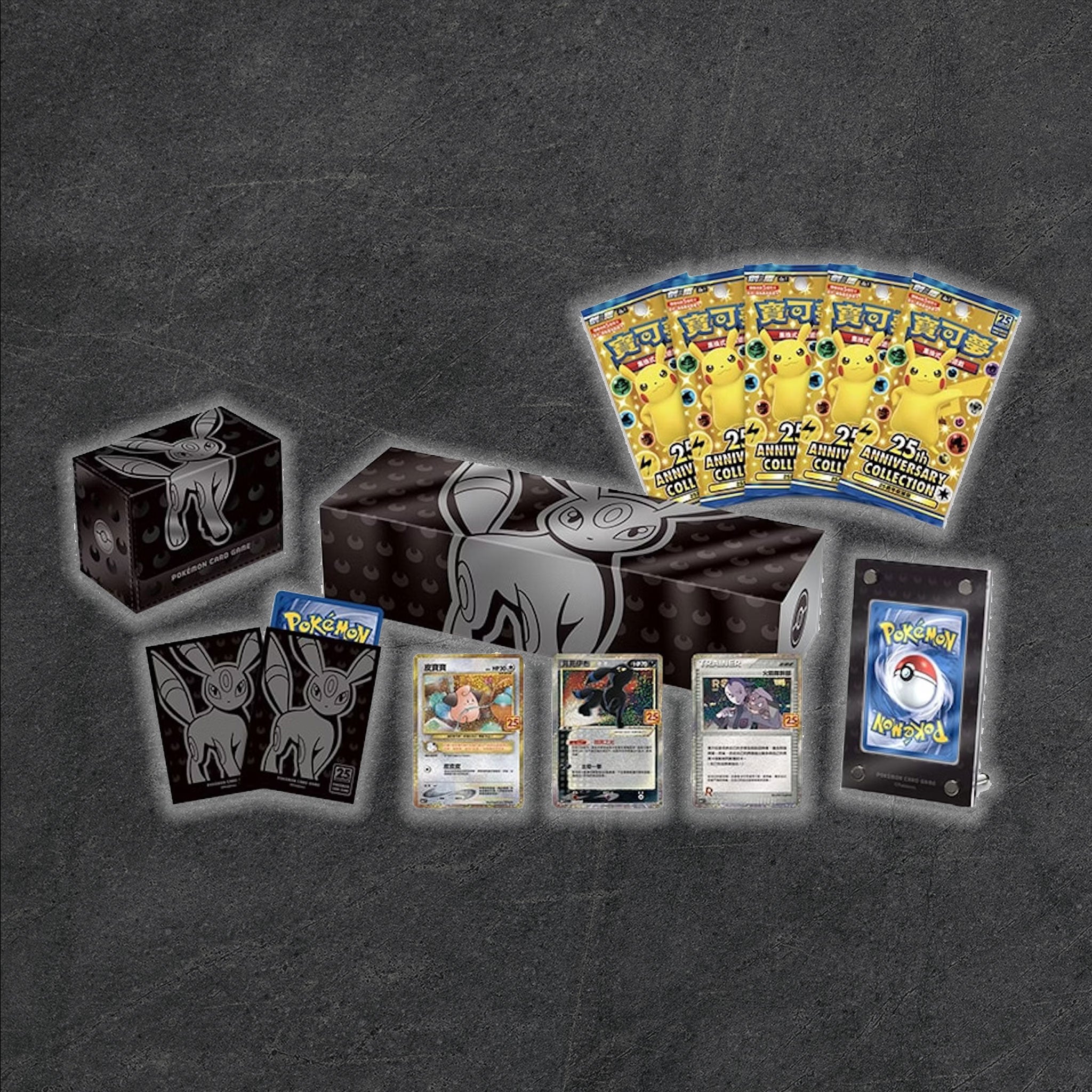 The Pokémon 25th Anniversary Collection Umbreon Box pays homage to the fan-favorite psychic Eeveelution with a special edition box and gameplay accessories. Inside of the box you will find three reprinted classic promo cards - Gold Star Umbreon, Cleffa, and Rocket's Admin from the Classic Collection s8a-P, 5 Pokémon 25th Anniversary booster packs, and Umbreon-themed accessories, including deck box, card sleeves, and card display. All cards included in the box come printed in Traditional Chinese.