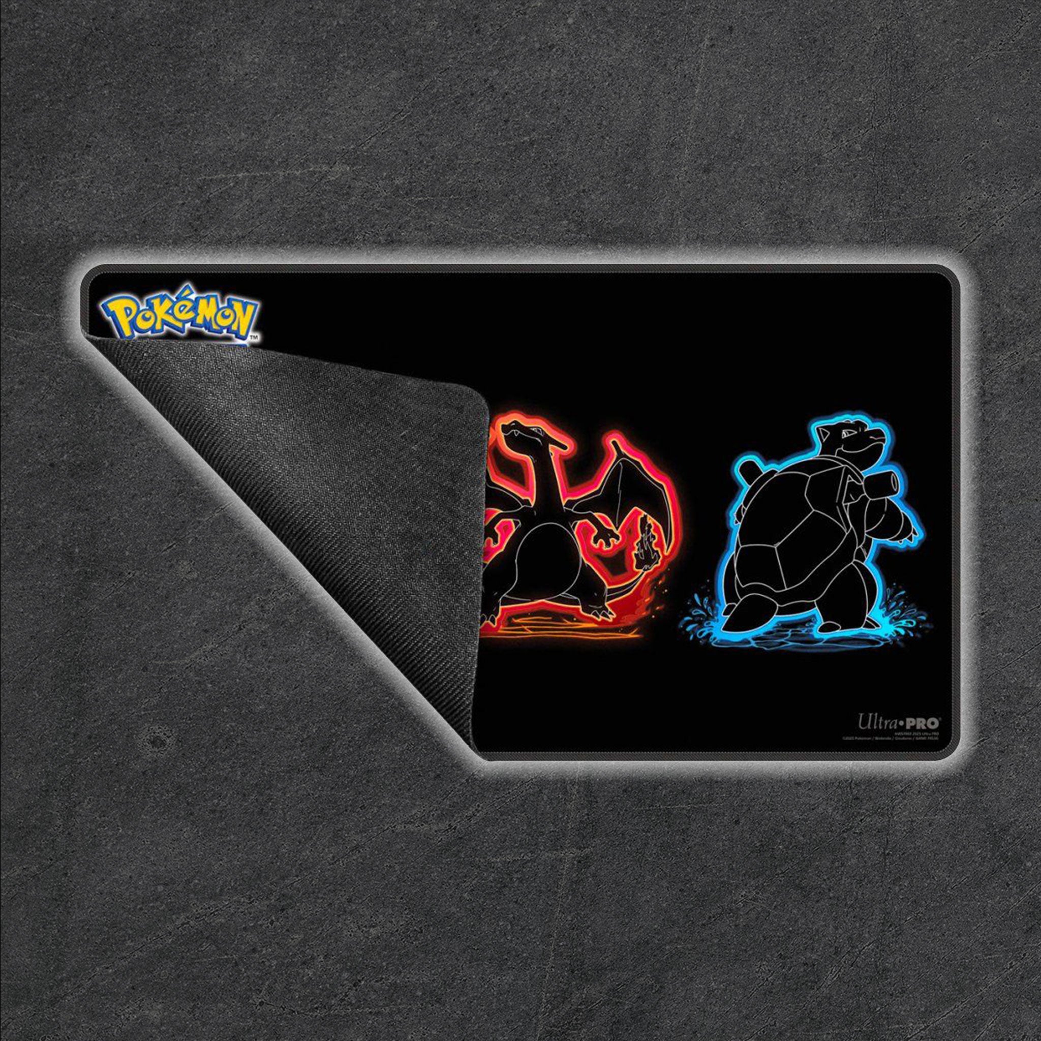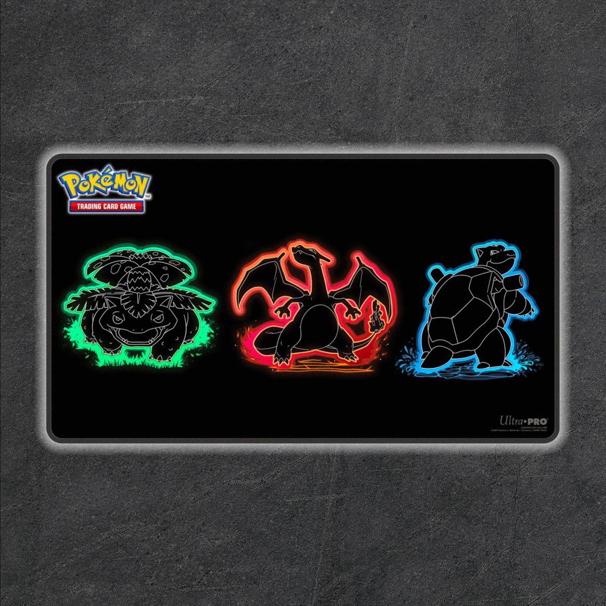 Make it a game to remember with Foil Playmats for the Pokémon Trading Card Game! With bold, neon-inspired artwork of Venusaur, Charizard, and Blastoise, this playmat features premium spot foil accents for added shine. Made with a soft fabric top to reduce damage to cards during play and a non-slip rubber backing to keep the playmat from shifting during use, playmats enhance the gameplay experience. With dimensions of approximately 24 in. x 13.5 in., a playmat also makes an excellent oversized mousepad for home or office.