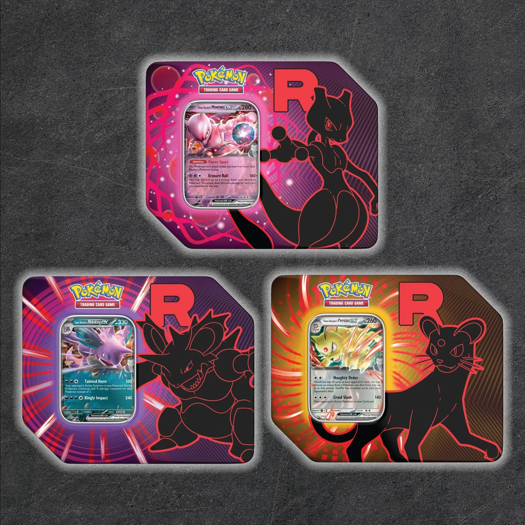 Bring your ambitious plans to fruition by joining forces with some of Team Rocket’s toughest Pokémon! With this tin, choose the strategic mind of Team Rocket’s Mewtwo ex, the potent toxins of Team Rocket’s Nidoking ex, or the prideful power of Team Rocket’s Persian ex as a foil promo card, then discover more Pokémon and Trainer cards inside a handful of booster packs.