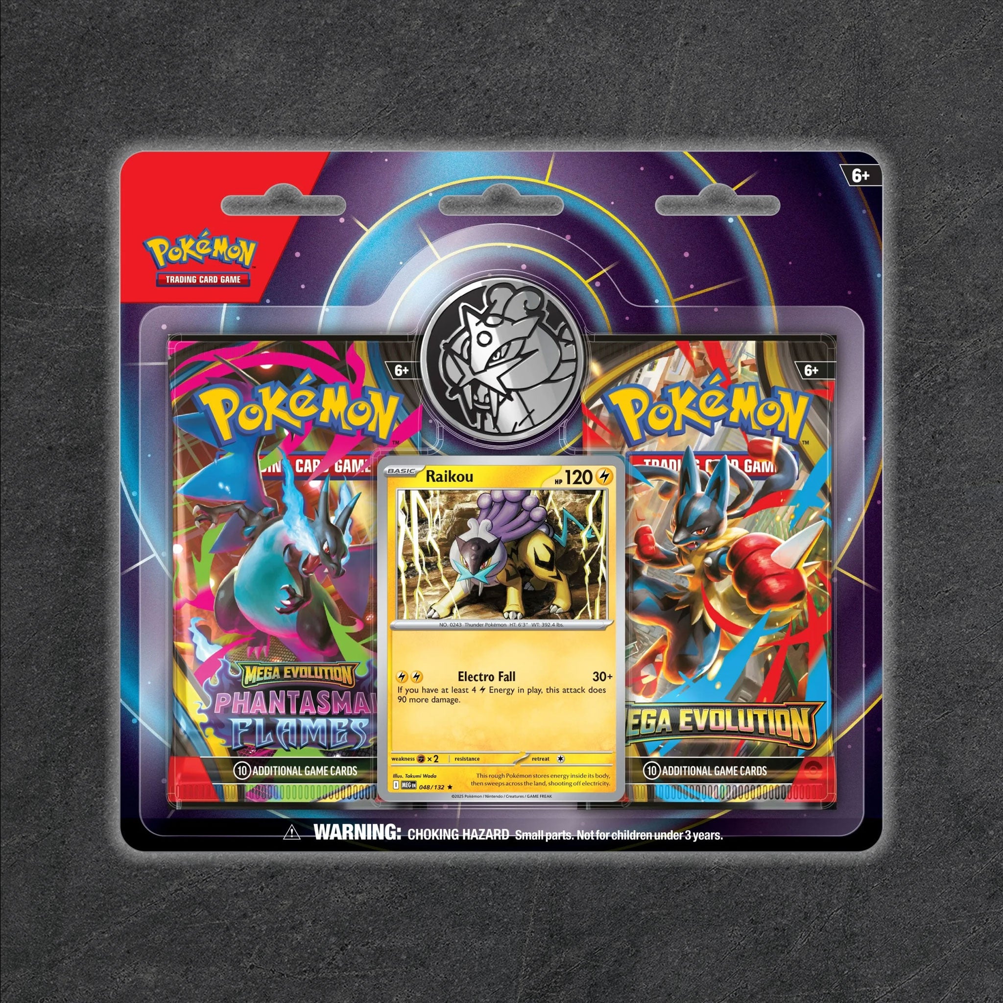 Expand your collection with a foil Pokémon TCG card featuring Raikou—plus a metallic coin and two Pokémon TCG booster packs!