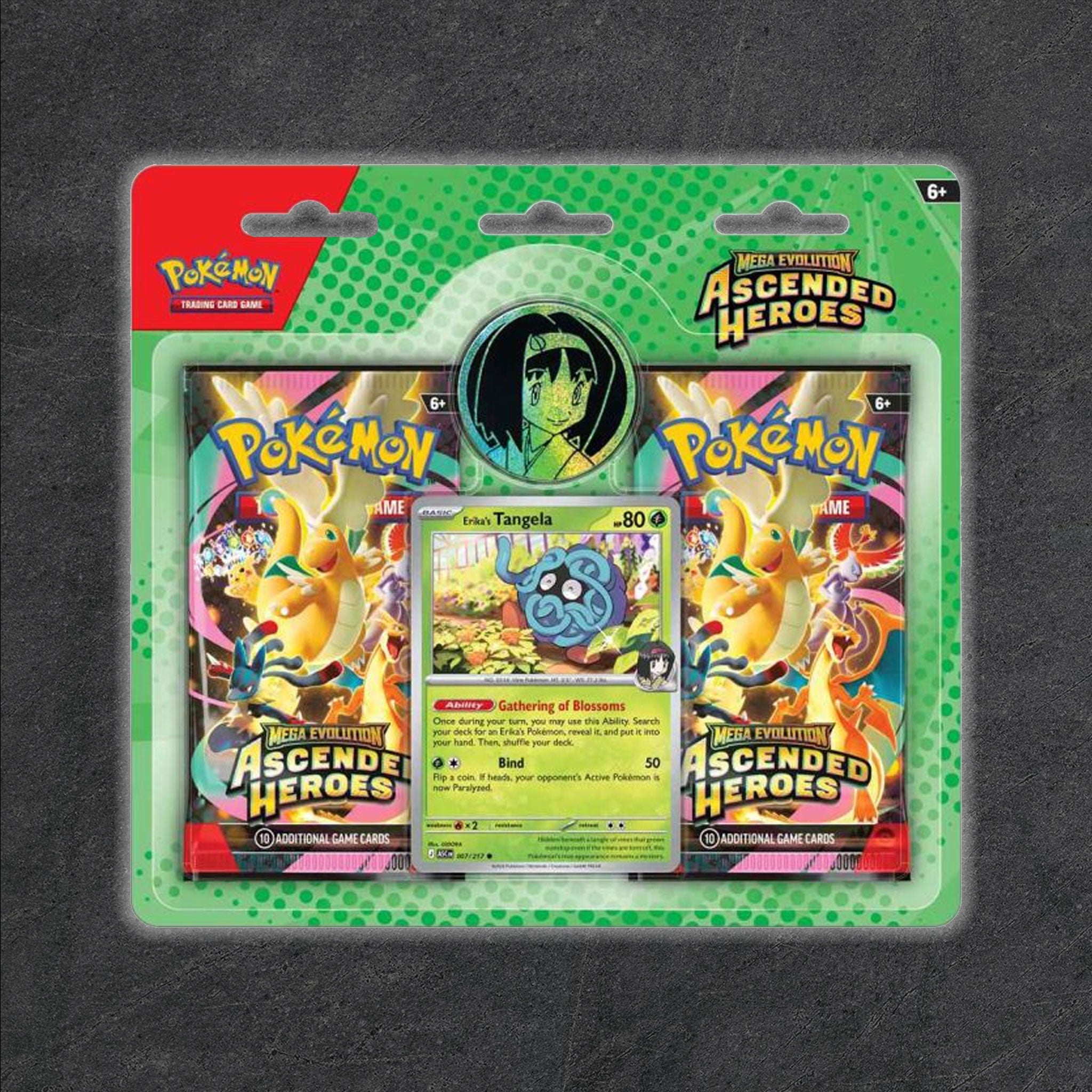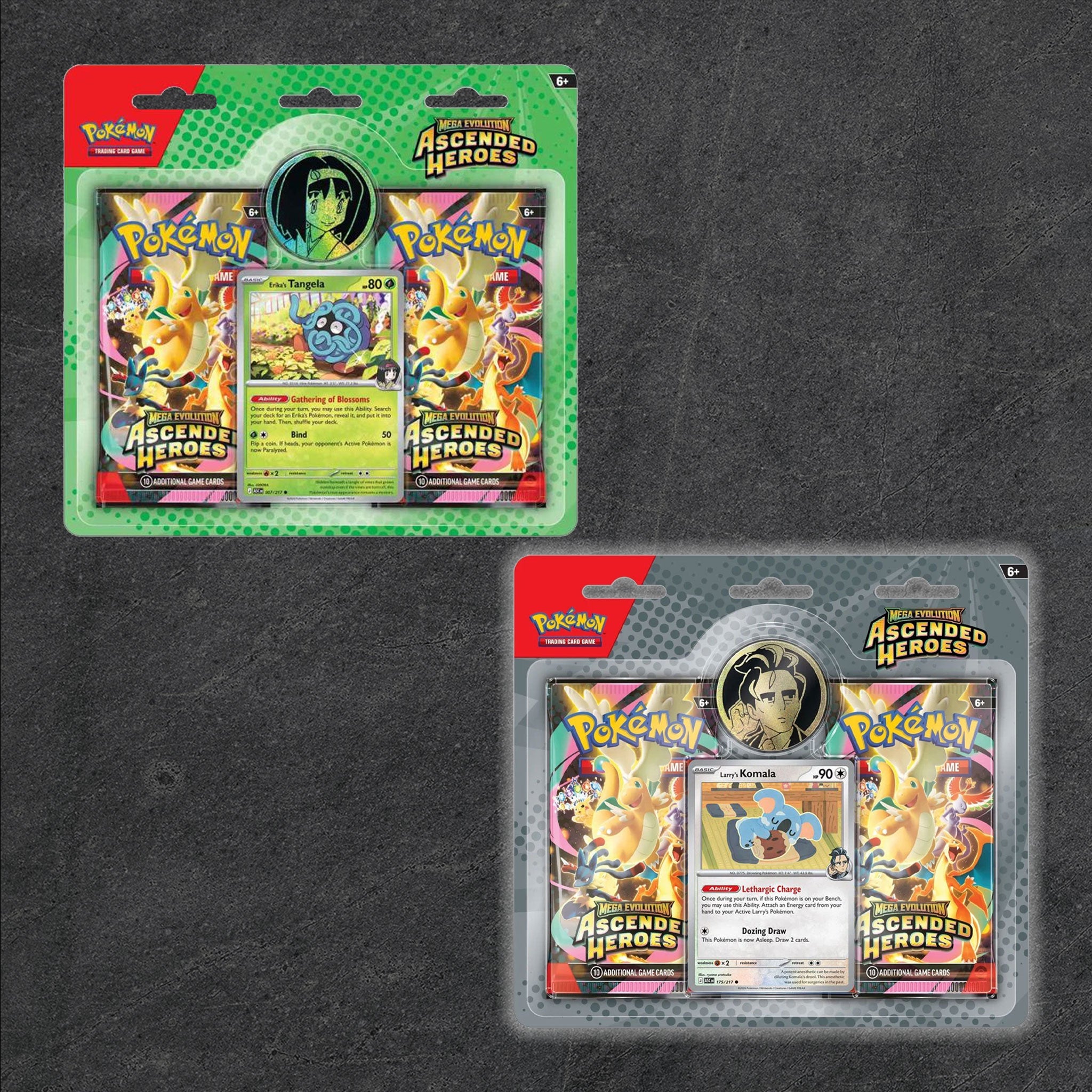 The Celadon City Gym, led by Gym Leader Erika, is filled with beautiful greenery and Grass-type Pokémon galore. Visitors to Medali in the Paldea region have the chance to battle Gym Leader Larry and his Normal type Pokémon. In this collection, you’ll find a promo card featuring either Erika’s Tangela or Larry’s Komala, a metallic coin featuring your chosen Gym Leader, and two booster packs from the special Mega Evolution—Ascended Heroes expansion.